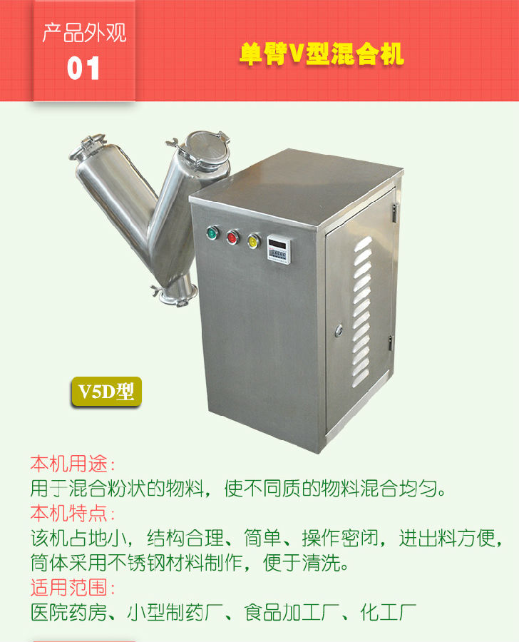 單臂V型混合機利用兩個不對稱的料筒,采用重力混合,物料在料筒內不斷聚中,不斷分散,一般經過5~15分鍾左右時間混合,使兩種或兩種以上充分混合均勻,特別適合對兩種或兩種以上的粉、粒狀物料,比重懸殊較大的混合,混合均勻度達99%以上,混合筒體內外壁經精密拋光處理,表麵光滑、平整、無死角、易清洗,本機與三維混合機、槽型混合機等產品功效齊全。