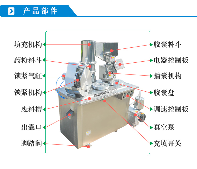 3.充填劑量準確,操作方便,機身及工作台麵采用不鏽鋼製造,產品符合規定的GMP要求。適用於粉狀、顆粒狀的藥品及保健品的膠囊充填。