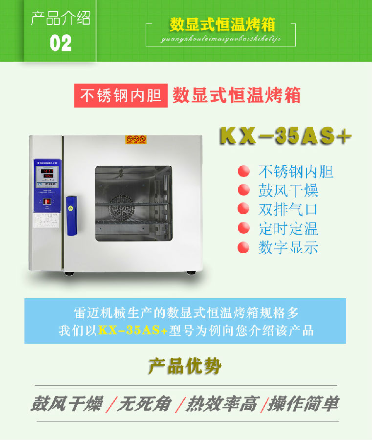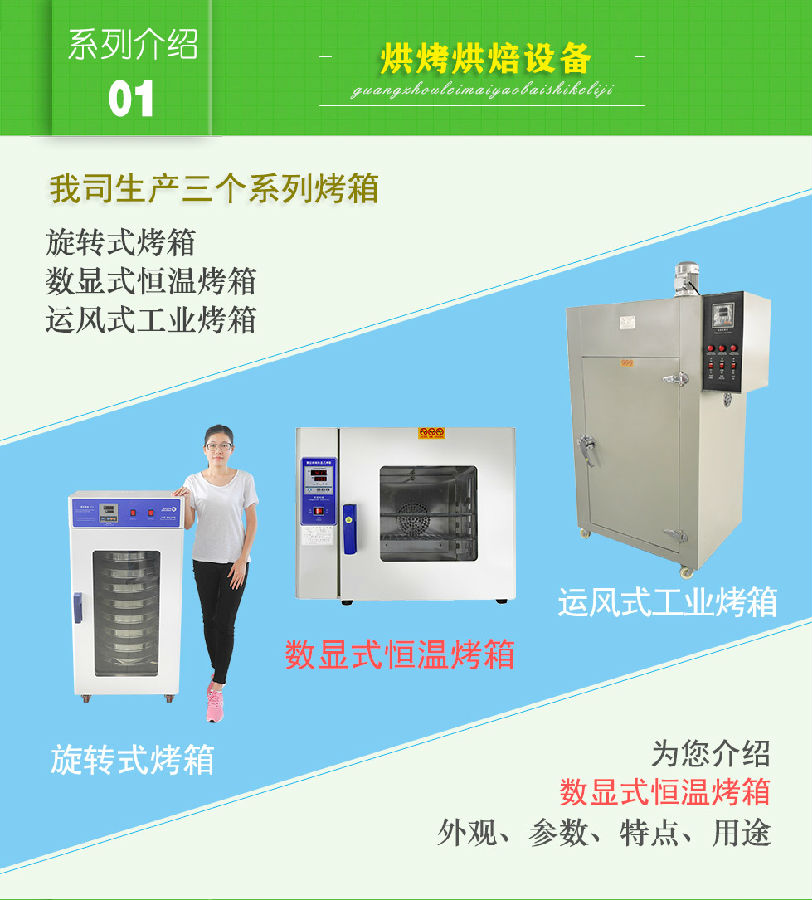 數顯式烤箱工作室後部裝有發熱管,後麵裝有鼓風裝置,溫度控製儀控製溫度恒定及高低,工作時經發熱管加熱再經鼓風裝置循環流動,確保溫度均勻,四周圓弧設計,擱板上下間距可調,內置感溫探頭。